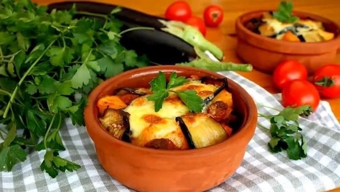 📍Diğer tarafta 3 adet uzun kemer patlıcanı alacalı olarak soyup, sap kısımlarını kesin. Bıçak yardımı ile uzunlamasına çok kalın ve ince olmayacak şekilde dilimleyin. 2 adet orta boy patatesin kabuğunu soyup, küpler halinde doğrayın. 1 adet domates, 2 adet yeşil biber, 1 adet orta boy soğan ve 2 diş sarımsağı ince ince doğrayın.