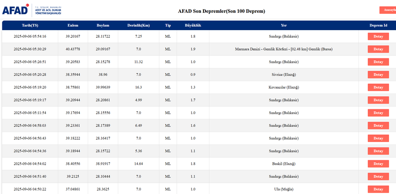 Kandilli Rasathanesi ve AFAD'ın resmi internet sitelerinde, yaşanan son depremlerin büyüklüğü, derinliği, saati ve merkezüssü ölçülerek kaydedilmektedir
