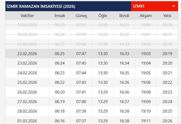 İZMİR RAMAZAN İMSAKİYESİ 2026