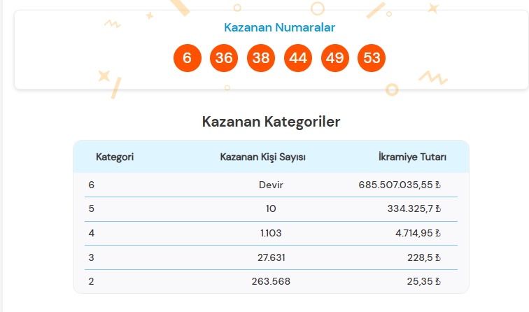 Bir önceki çekilişte (23 Nisan) 6 bilen çıkmadığı için tam 669.893.608 TL devretmişti. Bu akşamki çekilişle birlikte büyük ikramiye miktarının 700 milyon TL sınırına yaklaşması bekleniyor. 6 bilenler büyük ikramiyeyi paylaşırken; 5, 4, 3 ve 2 bilenler de ikramiye almaya hak kazanıyor.