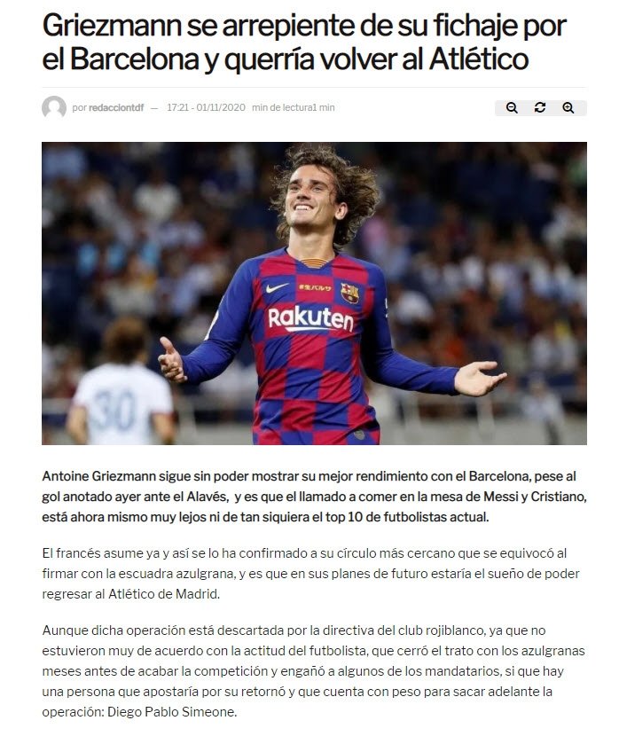 İspanyol basınında yer alan bilgilere göre Barcelona'da Griezmann, Alaves'e karşı gol atsa mental olarak kendini iyi hissetmiyor ve aidiyet duygusu neredeyse yok.