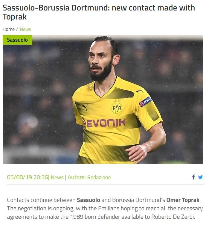 Ömer Toprak'ın Dortmund'da birinci tercih olmaktan çıktığı ve bu nedenle Sassuolo'ya gitmeye sıcak baktığı belirtiliyor.