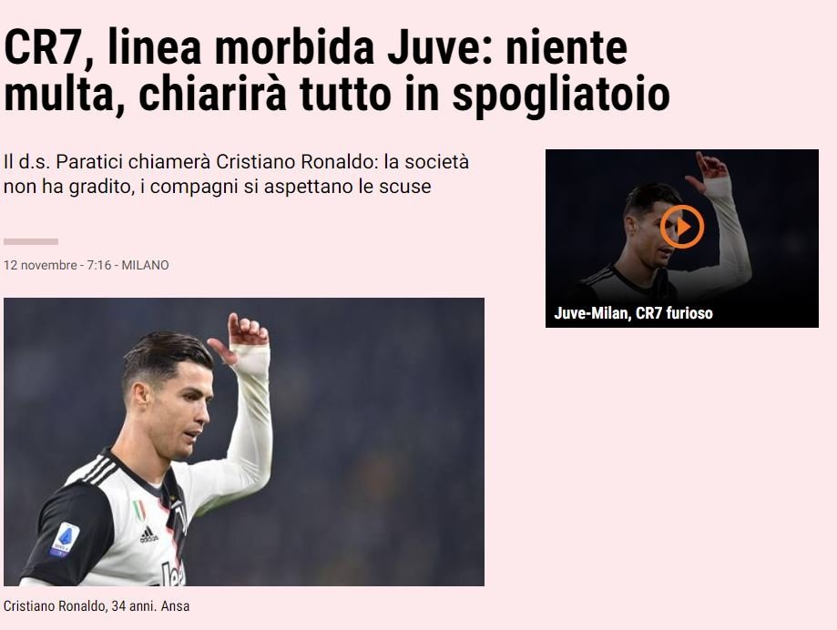 Milan ile oynanan karşılaşmanın 55. dakikasında oyundan alınan ve bu nedenle teknik direktör Maurizio Sarri ile sorun yaşayan Cristiano Ronaldo, mücadele bitmeden stadyumdan ayrılarak şok bir harekete imza atmıştı.
