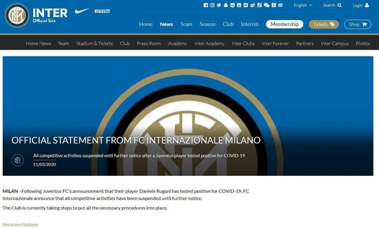 Juventus'un Daniele Rugani'nin koronavirüse yakalandığını açıklaması sonrası Inter'den flaş bir adım geldi: Milano kulübü, acil düzenlenen toplantıda alınan kararla maçlara çıkmayacaklarını ve tüm spor faaliyetleri durdurduklarını açıkladı.