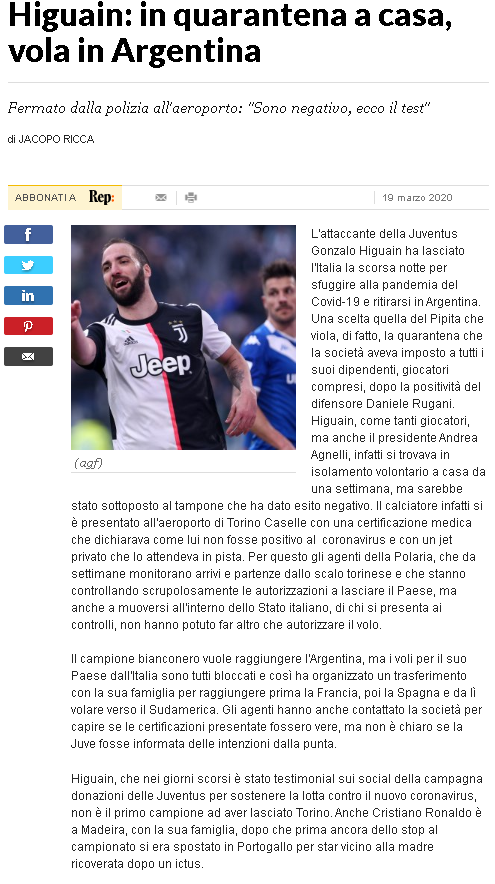 Higuain negatif çıkan koronavirüs testini gösterse de polisleri ikna edemedi ve evine gönderildi. Haberde, Arjantinli futbolcunun ailesini çok özlediği için ülkesine dönmek istediği ifade edildi.