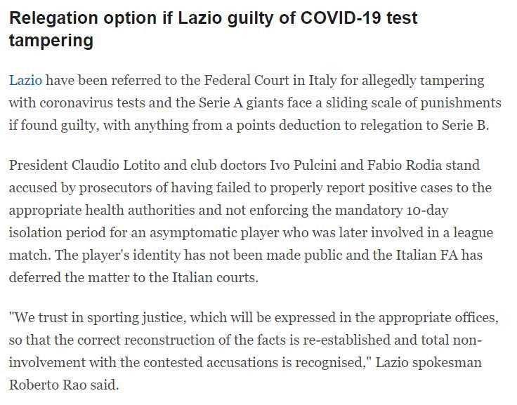 ESPN'de yer alan habere göre kulüp başkanı Claudio Lotito ile kulüp doktorları Ivo Pulcini ve Fabio Rodia pozitif vakaları, sağlık makamlarına doğru bir şekilde bildirmedi. Ayrıca semptom göstermeyen bir Covid-19'lu oyuncunun 10 günlük karantina süresini tamamlamadığı da ifade edildi. Oyuncunun kim olduğuna dair ise bir bilgi paylaşılmadı.