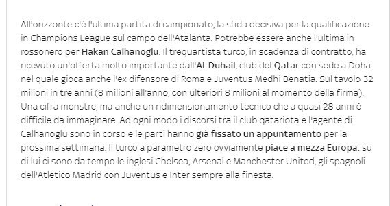 Sky Sport'un haberine göre; Al Duhail, Hakan Çalhanoğlu'na toplamda 32 milyon euro net maaş olmak üzere 3 yıllık sözleşme teklif etti. Çalhanoğlu'nun tercihini Avrupa takımlarından yana kullanmak istediği ifade edildi.