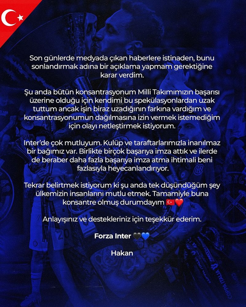Transferde adı Bayern Münih ile anılan A Milli yıldızımız Hakan Çalhanoğlu geleceğiyle ilgili sosyal medya hesabından açıklamada bulundu. Başarılı oyuncu yaptığı açıklamada, Inter'de kalacağını duyurdu.