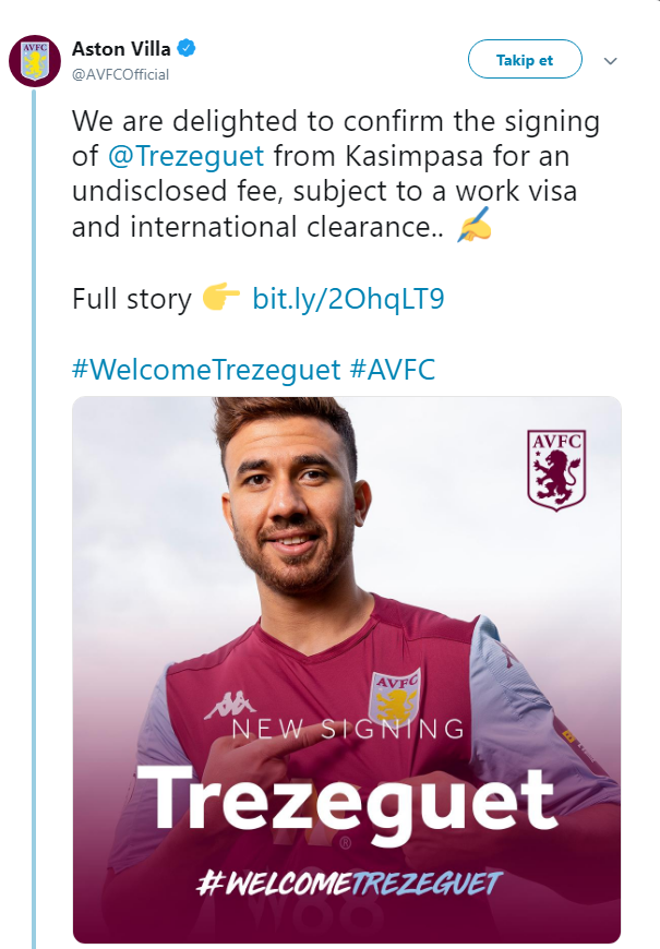 Kasımpaşa'nın yıldız ismi Trezeguet, Aston Villa'ya transfer oldu. İngiliz ekibi transferi resmen açıklarken, Kasımpaşa da veda mesajı yayınladı.