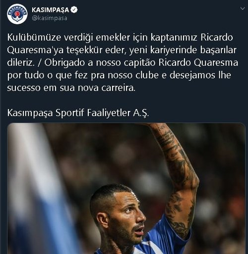 "Kulübümüze verdiği emekler için kaptanımız Ricardo Quaresma'ya teşekkür eder, yeni kariyerinde başarılar dileriz. / Obrigado a nosso capitão Ricardo Quaresma por tudo o que fez pra nosso clube e desejamos lhe sucesso em sua nova carreira." ifadelerine yer verildi.