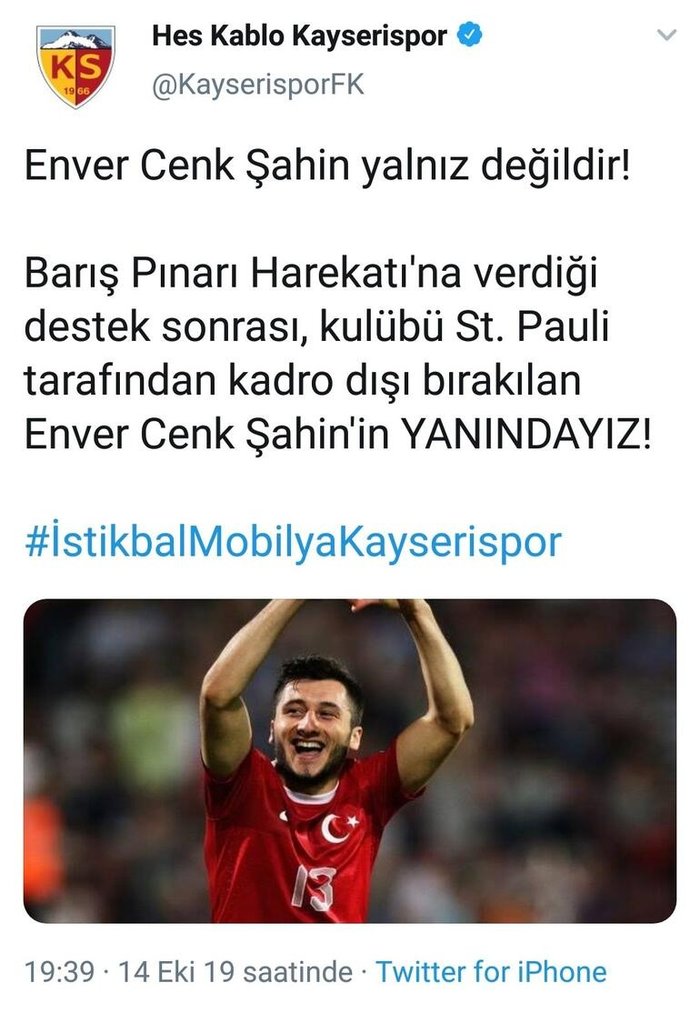 Kayserispor o dönem birçok takım gibi sosyal medya paylaşımıyla Enver Cenk Şahin'e destek olmuştu;