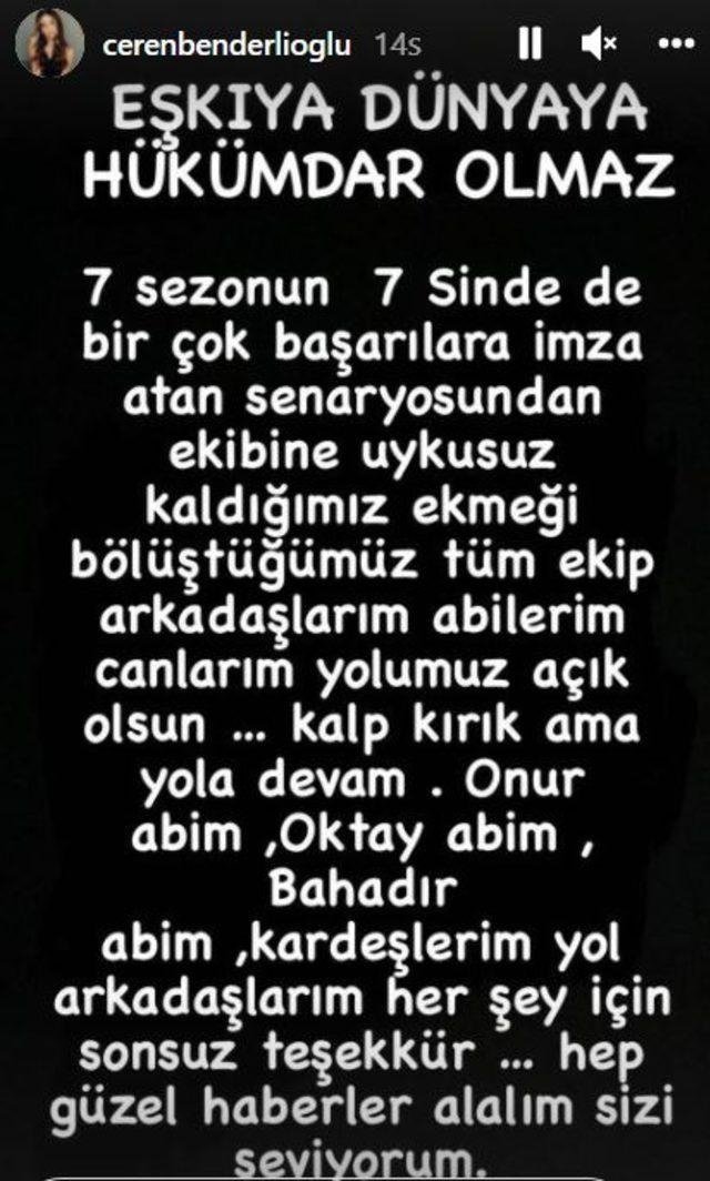 7 senenin 7'sinde de birçok başarılara imza atan, senaryosundan ekibine uykusuz kaldığımız, ekmeği bölüştüğümüz tüm ekip arkadaşlarım, abilerim, canlarım... Yolumuz açık olsun. Kalp kırık ama yola devam. Onur Abim, Oktay Abim, Bahadır Abim, kardeşlerim, yol arkadaşlarım. Her şey için sonsuz teşekkürler. Hep güzel haberler alalım, sizi seviyorum."