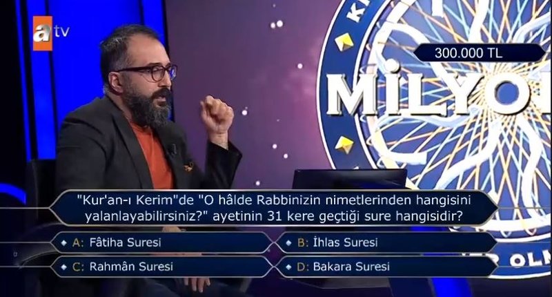 atv'nin sevilen yarışma programı Kim Milyoner Olmak İster her hafta Pazar akşamları yayınlanıyor. İzleyicilerin ilgiyle takip ettiği programda "Kur'an-ı Kerim'de "O halde Rabbinizin nimetlerinden hangisini yalanlayabilirsiniz?" ayetinin 31 kere geçtiği sure hangisidir?" sorusu soruldu. Yanıtı ve detayları sizler için derledik.