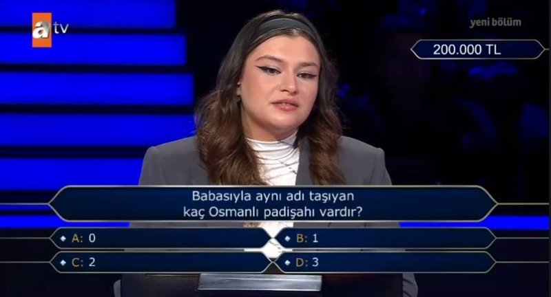 atv'nin sevilen yarışma programı Kim Milyoner Olmak İster her hafta Pazar akşamları yayınlanıyor. İzleyicilerin ilgiyle takip ettiği programda "Babasıyla aynı adı taşıyan kaç Osmanlı padişahı vardır?" sorusu soruldu. Yanıtı ve detayları sizler için derledik.