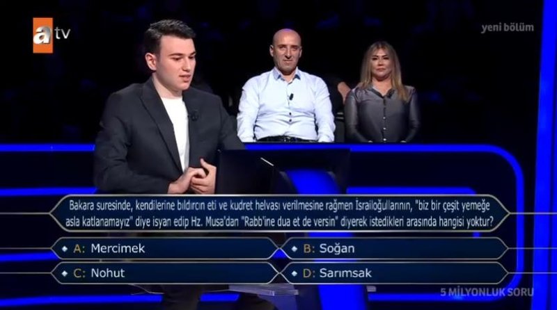 atv'nin sevilen yarışma programı Kim Milyoner Olmak İster her hafta Pazar akşamları yayınlanıyor. İzleyicilerin ilgiyle takip ettiği programda "Bakara Suresi'nde "Rabb'ine dua et de versin" diyerek istedikleri arasında hangisi yoktur?" sorusu soruldu. 5 milyon TL değerindeki sorunun yanıtı ve detayları sizler için derledik.