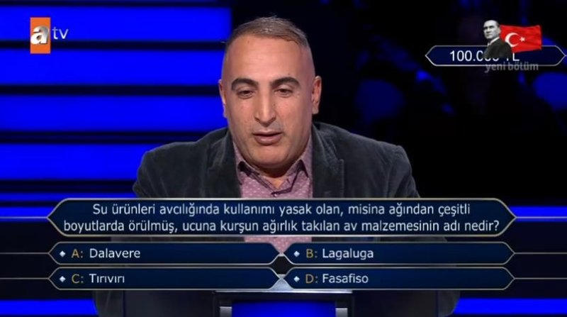 atv'nin sevilen yarışma programı Kim Milyoner Olmak İster her hafta Pazar akşamları yayınlanıyor. İzleyicilerin ilgiyle takip ettiği programda "Su ürünleri avcılığında yasak olan, misina ağından çeşitli boyutlarda örülmüş, ucuna kurşun ağırlık takılan av malzemesinin adı nedir?" sorusu soruldu. Yanıtı ve detayları sizler için derledik.