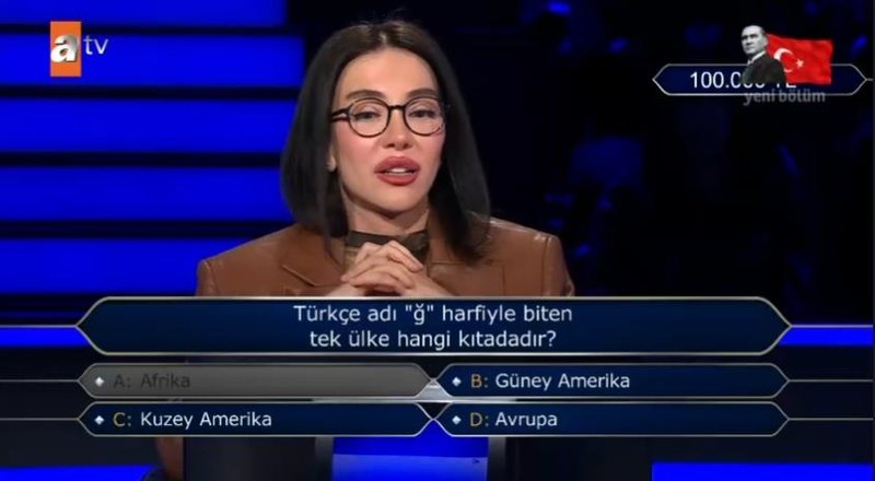 atv'nin sevilen yarışma programı Kim Milyoner Olmak İster her hafta Pazar akşamları yayınlanıyor. İzleyicilerin ilgiyle takip ettiği programda "Türkçe adı "ğ" harfiyle biten tek ülke hangi kıtadadır?" sorusu soruldu. Yanıtı ve detayları sizler için derledik.