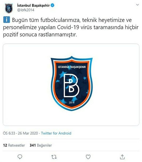 "Bugün tüm futbolcularımıza, teknik heyetimize ve personelimize yapılan Kovid-19 virüs taramasında hiçbir pozitif sonuca rastlanmamıştır."