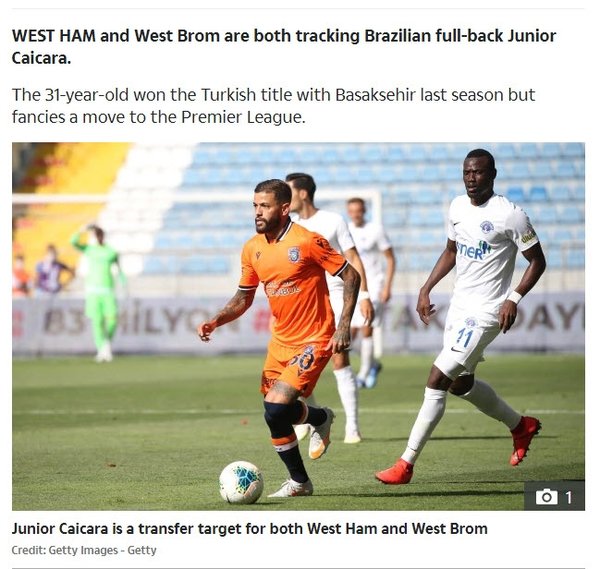 Medipol Başakşehir'in başarılı sağ beki Junior Caiçara'ya İngiltere'den iki takımın talip olduğu iddia edildi. West Ham United ve West Bromwich Albion'un deneyimli futbolcu'yu kadrosuna katmak istediği öne sürüldü.
