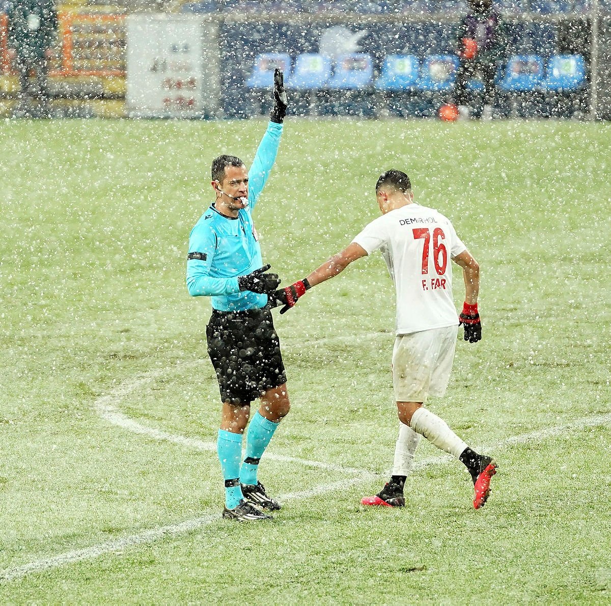 Başakşehir-Sivasspor maçında etkili olan kar yağışı nedeniyle hakem Alper Ulusoy, müsabakanın 4. dakikasında görüşü kolaylaştıran turuncu topu istedi.