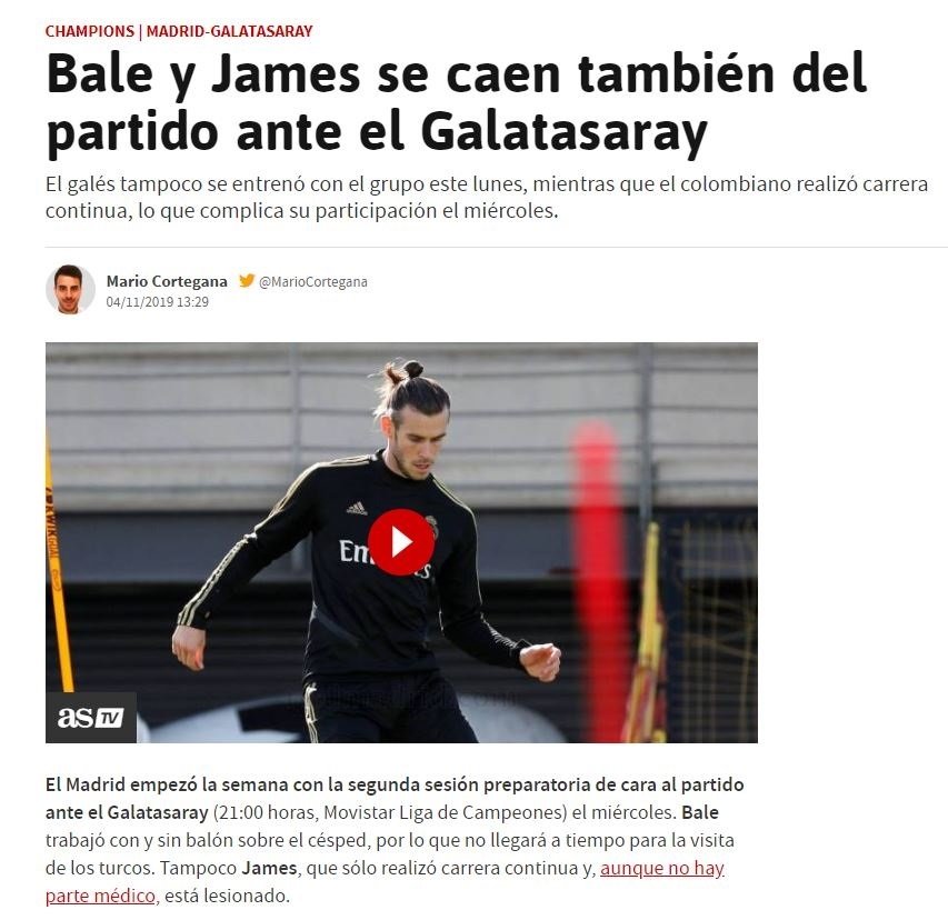 Bu mücadele öncesi İspanyol basınından eflatun-beyazlı ekiple ilgili flaş bir haber geldi. Galatasaray maçı öncesi yapılan antrenmanda takımla birlikte çalışmayan James Rodriguez ve Gareth Bale'in sarı-kırmızılı takıma karşı forma giyemeyeceği öğrenildi.