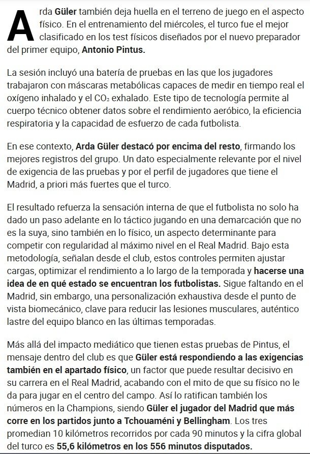Arda'nın yanı sıra Fran García, Fede Valverde ve David Alaba da fiziksel test gününün öne çıkan isimleri arasında yer aldı. Bu tür testlerde istikrarlı şekilde öne çıkan Federico Valverde de yine yüksek tempoyu uzun süre koruyabilme özelliğini kanıtladı ve fiziksel güvenilirliğini bir kez daha teyit etti. Sezon içinde az süre almasına ve birkaç kas sakatlığı yaşamasına rağmen, David Alaba'nın da dayanıklılığı, testte dikkat çeken veriler arasında yer aldı.