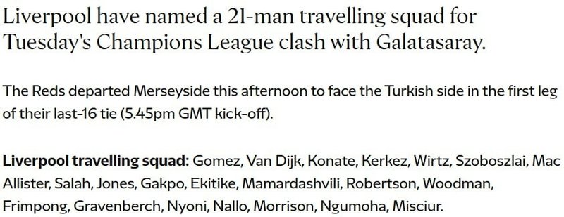 Galatasaray, 10 Mart Salı günü UEFA Şampiyonlar Ligi son 16 turu ilk maçında Liverpool'u ağırlayacak. İngiliz ekibi İstanbul kafilesini açıkladı.