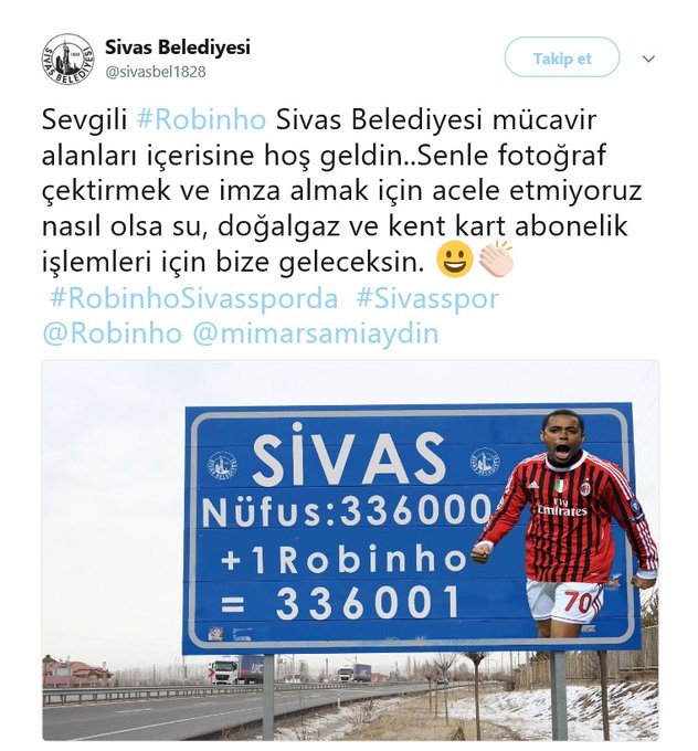 Mesajda, "Sevgili Robinho, Sivas Belediyesi mücavir alanları içerisine hoş geldin. Seninle fotoğraf çektirmek ve imza almak için acele etmiyoruz. Nasıl olsa su, doğal gaz ve kentkart abonelik işlemleri için bize geleceksin." ifadelerine yer verildi.