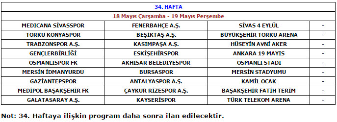 Spor Toto Süper Lig'de 34. Hafta'nın müsabaka günleri ve saatleri önümüzdeki haftalarda kamuoyuyla paylaşılacak.