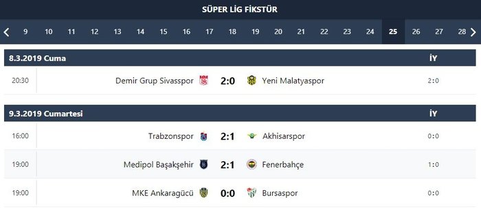 Süper Lig'de 25. hafta maçları bu akşam oynanacak olan Galatasaray-Antalyaspor maçı ile tamamlanacak. Cuma akşamı Sivasspor-Yeni Malatyaspor maçı ile start alan Süper Lig'in 25. haftasının ilk maçında gülen taraf Sivasspor oldu. Cumartesi günü liderlik yarışı açısından kritik öneme sahip olan Başakşehir-Fenerbahçe maçında gülen taraf ev sahibi Başakşehir oldu. Lig'de son haftalara yaklaşırken liderlik yarışı ve küme düşme hattında da işler kızışıyor.