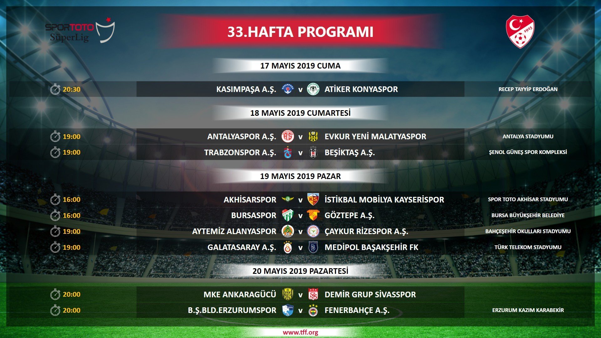 SPOR TOTO SÜPER LİG 32-33. HAFTA PROGRAMI ŞÖYLE;