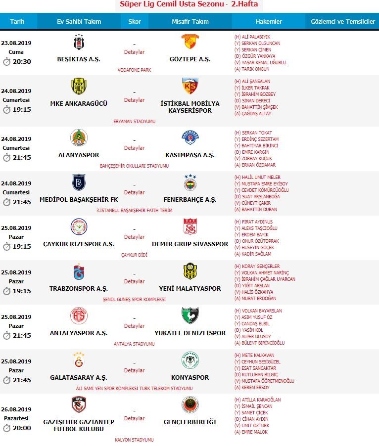 Türkiye Futbol Federasyonu Merkez Hakem Kurulundan yapılan açıklamaya göre, ligin 2. haftasındaki müsabakalarda düdük çalacak hakemler şunlar: