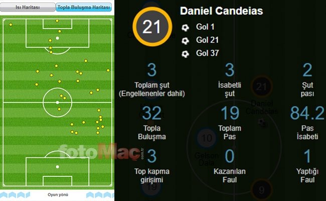 Maça 3 gol ve 2 asistle damga vuran Daniel Candeias'ın Antalyaspor karşısındaki topla buluşma noktaları ve oyuncunun ilk yarı özeti da şu şekilde;
