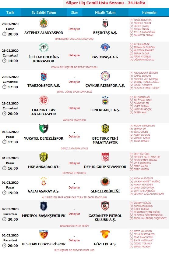 Süper Lig'de 24. hafta müsabakalarını yönetecek hakem listeleri açıklandı. Türkiye Futbol Federasyonu'nun internet sitesinden yapılan açıklamada, geçtiğimiz hafta Fenerbahçe-Galatasaray derbisini yöneten Halil Umut Meler'e herhangi bir görev verilmemesi dikkat çekti. Beşiktaş-Trabzonspor maçını yöneten Fırat Aydınus ise bu hafta İttifak Holding Konyaspor-Kasımpaşa mücadelesinde VAR olarak görev yapacak.