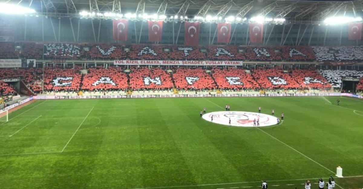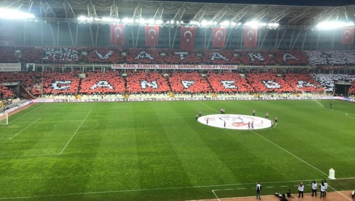 Sivassporlu taraftarların ellerindeki kartonları kaldırarak hazırladığı koreografide yer alan "Vatana can feda" ifadesi dikkat çekerken, stat hoparlörlerinden de bu sırada Osmanlı Marşı çalındı.