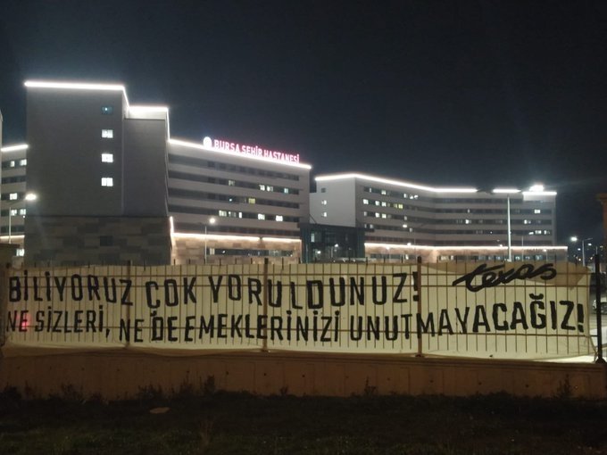 Bursaspor'un taraftar grubu Teksas, sağlık çalışanlarına destek amacıyla şehirdeki hastanelere pankart astı. Yeşil-beyazlı taraftarların hazırladıkları pankartlarda şunlar yazdı: "Biliyoruz çok yoruldunuz! Ne sizleri, ne de emeklerinizi unutmayacağız!"