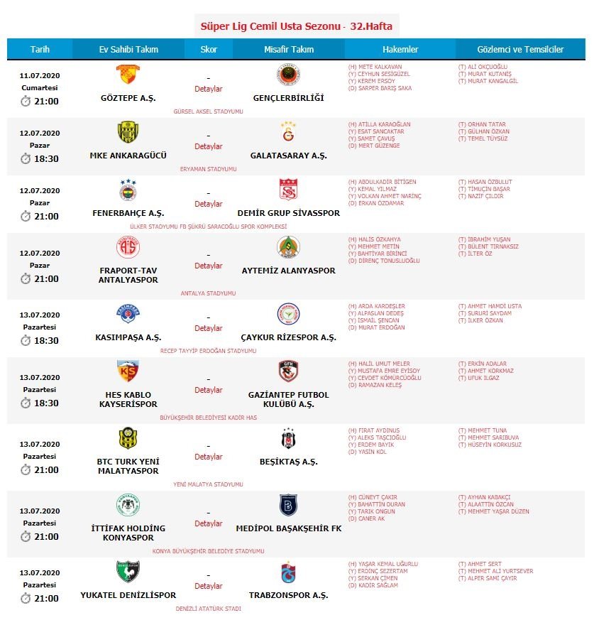 Süper Lig'de 32. hafta müsabakalarını yönetecek hakem listeleri belli oldu. TFF'nin resmi internet sitesinden yayınlanan bilgilere göre şampiyonluk yolunda yarışan Trabzonspor'un deplasmanda Denizlispor ile oynayacağı karşılaşmayı Yaşar Kemal Uğurlu, Medipol Başakşehir'in deplasmanda Konyaspor ile yapacağı maçı ise Cüneyt Çakır yönetecek.