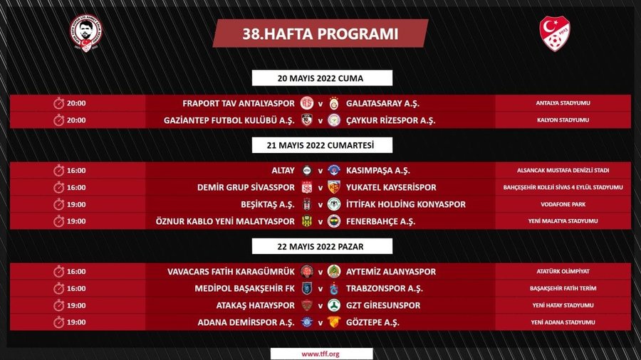 Türkiye Futbol Federasyonunun internet sitesinden yapılan açıklamaya göre, ligin son haftasının maç programı şöyle: