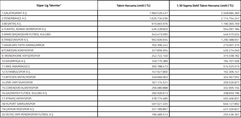 TFF'den yapılan açıklamaya göre, takımların harcama limitleri şöyle: