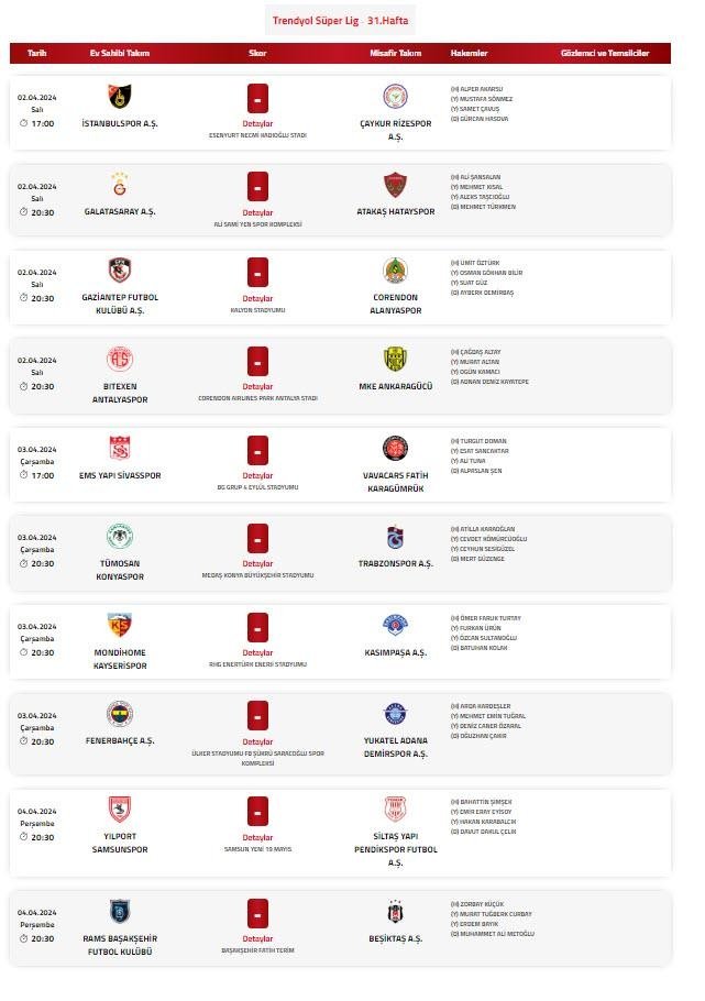 Türkiye Futbol Federasyonu'ndan yapılan açıklamaya göre, dijital atamayla belirlenen ligin 31'inci haftasında görev yapacak hakemler şöyle: