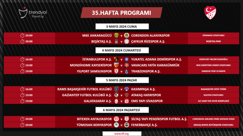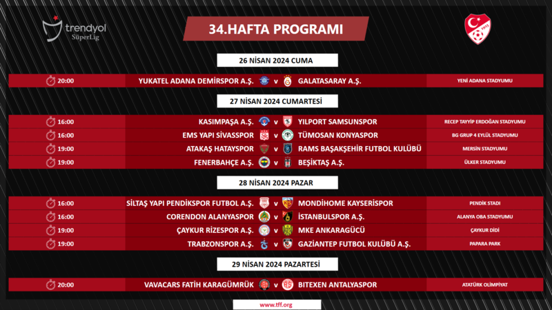 Trendyol Süper Lig'de 34. ve 35. hafta müsabakalarına ilişkin programlar açıklandı. TFF'den yapılan duyuruda, daha önceki sezonlarda olduğu gibi ligin son 3 haftasında birbirini ilgilendiren maçlar aynı gün ve saatlerde oynatılacağı ifade edildi.