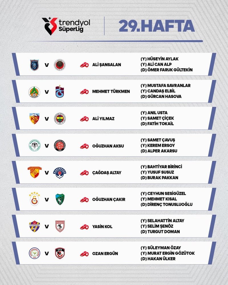 Trendyol Süper Lig'de 29. hafta maçlarında düdük çalacak hakemler belli oldu. Türkiye Futbol Federasyonu (TFF) Merkez Hakem Kurulundan (MHK) yapılan açıklamaya göre maçlarda görev alacak hakemler şöyle: