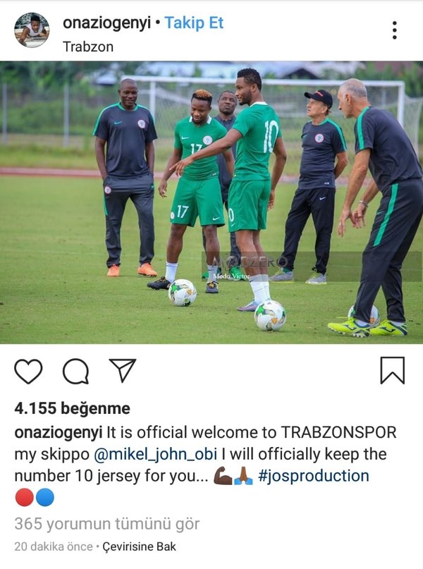 Onazi sosyal medya hesabından yaptığı paylaşımla Obi Mikel'in Trabzonspor'a transfer olduğunu açıkladı. İşte Onazi'nin o paylaşımı...