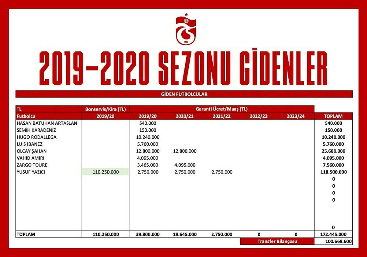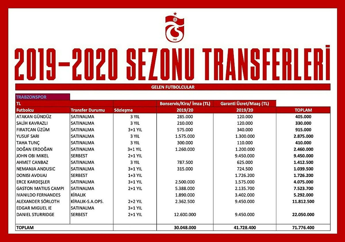 "2019 - 2020 transfer tescil döneminde 16 oyuncuyu kadromuza kattık. Bu oyunculardan üçü serbest statüde, ikisi kiralık. Dört futbolcumuzun transferine hiçbir ücret ödemedik. Diğerlerini de bonservisiyle birlikte aldık. Ödediğimiz bonservis, kiralama ve imza bedeli toplamda 30 milyon 048 bin TL. Kadromuza yeni katılan oyuncuların bu sezonki maaş ücretlerinin toplamı 41 milyon 728 bin 400 TL. Ayrıca yolları ayırdığımız 8 oyuncumuz için bu yıl 39 milyon 800 bin TL, toplamda ise 62 milyon 195 bin TL'lik maliyetten kurtulduk.