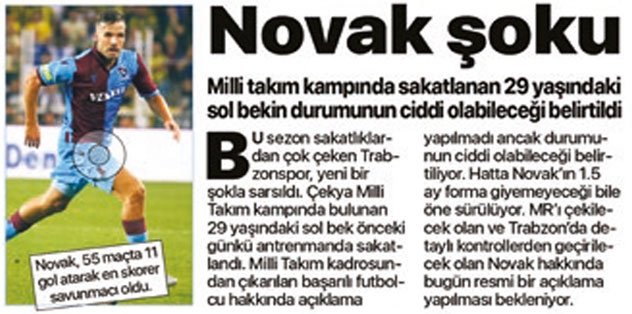 "Çekya Milli Takım antrenmanında aldığı darbe sonucu sakatlanan Novak'ın milli takım doktoru tarafından yapılan ilk muayenesi ve tetkikleri sonucu sağ alt baldır soleus adalesinde kısmi yırtık tespit edilmiş olup ilk değerlendirmelere göre 6 hafta civarında sahalardan uzak kalacağı sağlık kurulumuza iletilmiştir. Oyuncumuz pazar günü Trabzon'a gelecek ve burada kulüp doktorumuz M.Hakan Ayaz tarafından muayene edilecektir. U21 milli takım kampında kasığındaki ağrıları nedeniyle kadrodan çıkartılan Yusuf Sarı ise Trabzon'a gelecek ve tedavisine burada başlanacaktır." Novak'ın takımda alternatifinin bulunmaması teknik heyetin moralini bozdu. Daha önce 29 yaşındaki sol bek sakatlandığında Kamil Ahmet o bölgeye kaydırılmıştı. Teknik direktör Ünal Karaman, Kamil'i yine sol bekte oynatabilir.