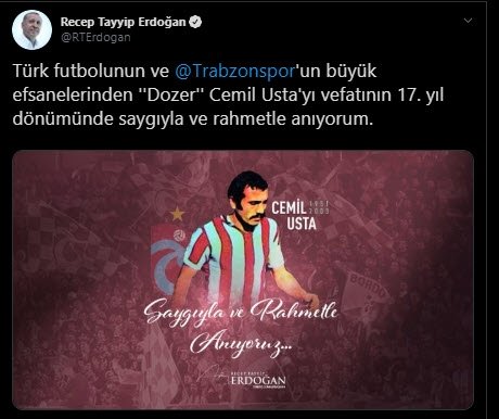 Başkan Erdoğan, bu sezon Süper Lig'e ismi verilen, Türk futbolu ve Trabzonspor'un önemli ismi Cemil Usta'nın 17. yıl dönümünü andı.