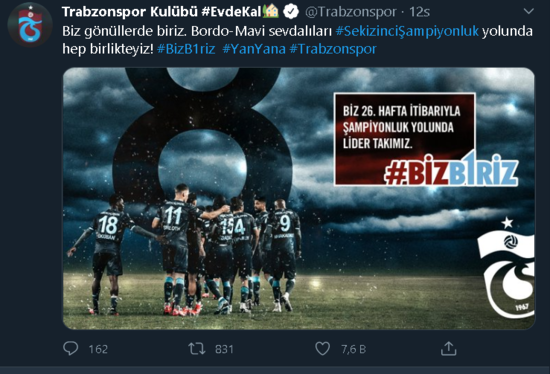 Bordo-mavililer, sosyal medya üzerinden şampiyonluk motivasyonuna devam ediyor. Kulübün twitter hesabından bu kez, "Biz gönüllerde biriz. Bordo- Mavi sevdalıları #SekizinciŞampiyonluk yolunda hep birlikteyiz! #BizB1riz #YanYana #Trabzonspor" mesajı paylaşıldı. Paylaşımlar taraftarlardan çok sayıda retweet aldı.