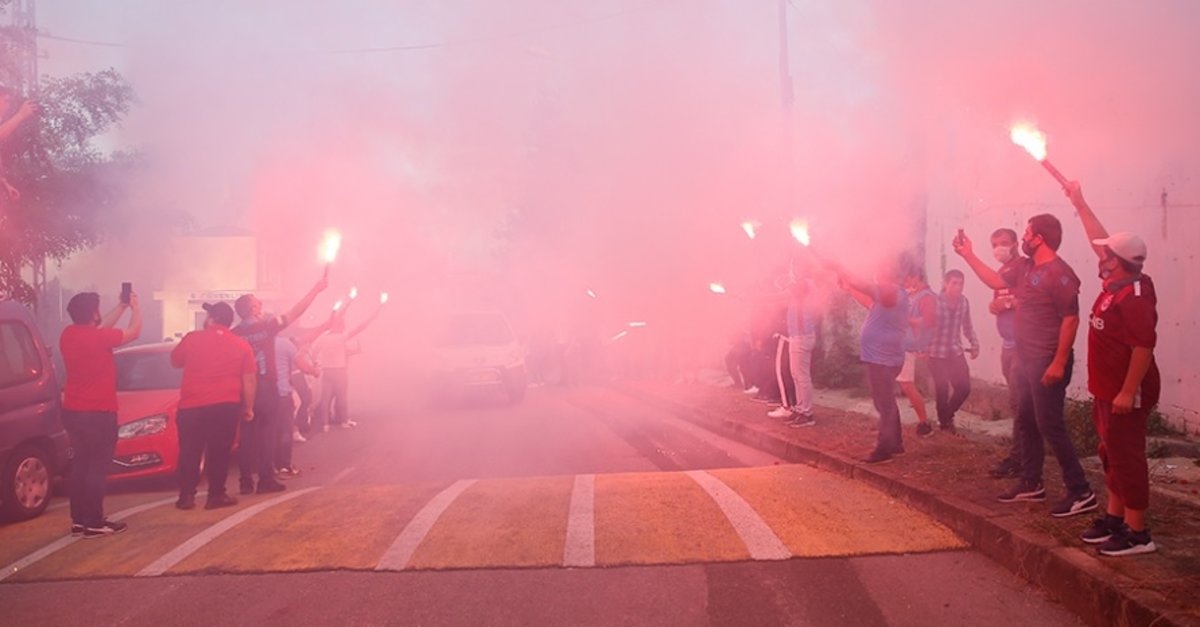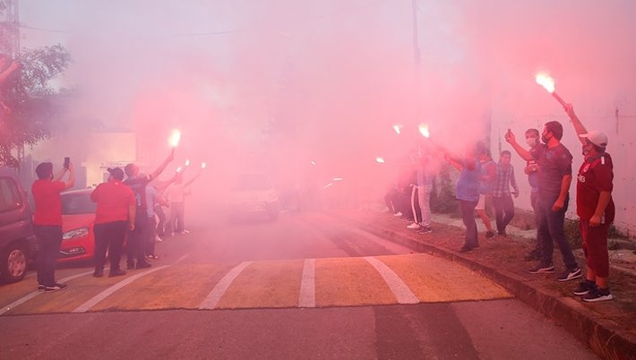Kafilenin gidişi nedeniyle tesislerin önünde bir araya gelen taraftarlar, tezahüratlarda bulundu. Bordo-mavili futbolseverler, meşaleler yakarak takıma havalimanına kadar eşlik etti.