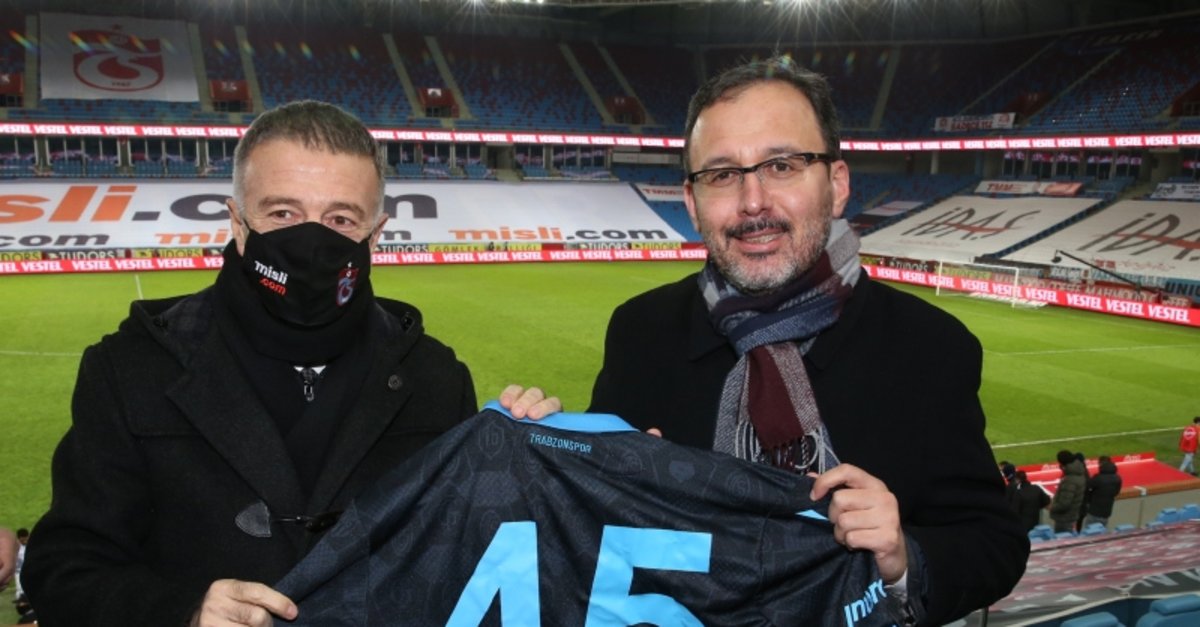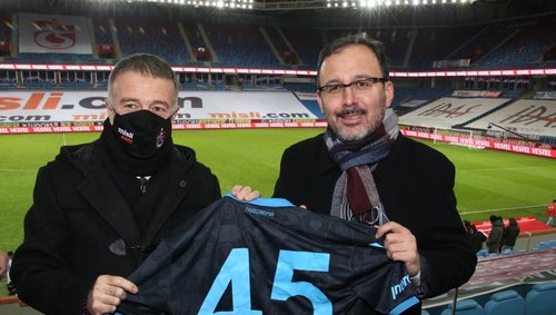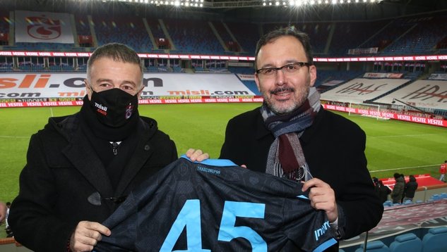 Trabzon'a gelen Gençlik ve Spor Bakanı Dr. Mehmet Muharrem Kasapoğlu, Trabzonspor-İttifak Holding Konyaspor karşılaşmasını Şenol Güneş Stadı'nda izledi. Bakan Kasapoğlu'na, Trabzonspor Başkanı Ahmet Ağaoğlu, 45 numaralı forma ve hediyeler verdi. Kasapoğlu, mücadeleyi Ağaoğlu ile birlikte takip etti.