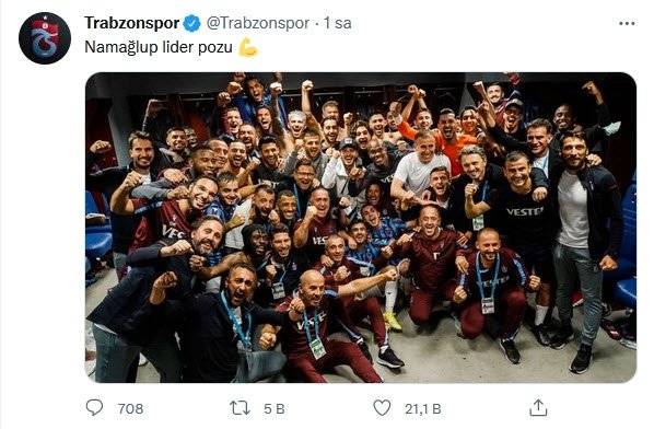 Trabzonspor sosyal medya hesabından, Fenerbahçe galibiyeti sonrası paylaşımda bulundu. Tüm takımın bütünleşip sevinç yumağı oluşturduğu fotoğrafı paylaşan bordo-mavililer, 'Namağlup lider' notunu düştü.